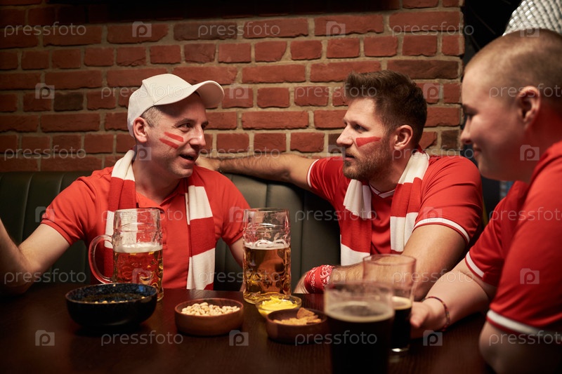 Группа фанатов спорта, смотрящих и обсуждающих футбольный матч в баре
