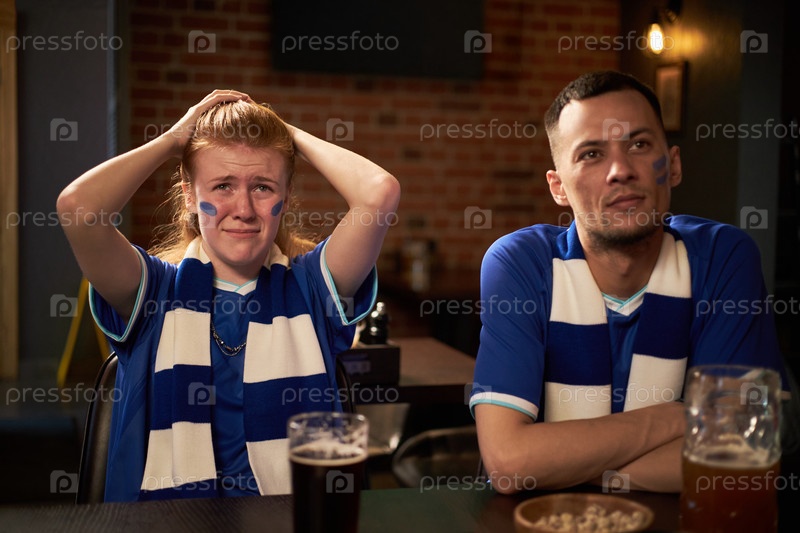 Молодая женщина и молодой мужчина эмоционально реагируют во время просмотра футбольного матча