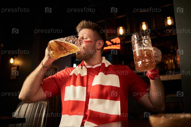 Спортивный фанат празднует победу в футболе, выпивая пиво