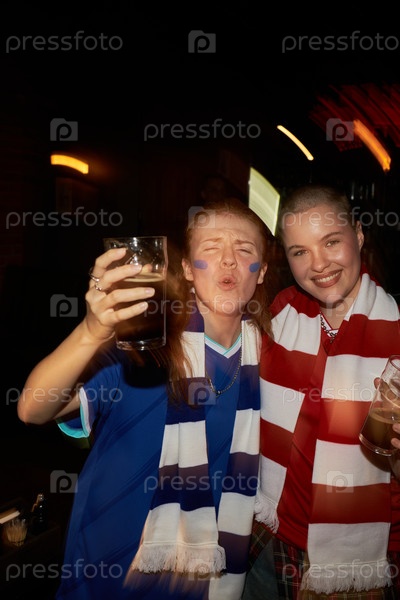 Две молодые женщины празднуют победу на футбольном матче в спортивном пабе