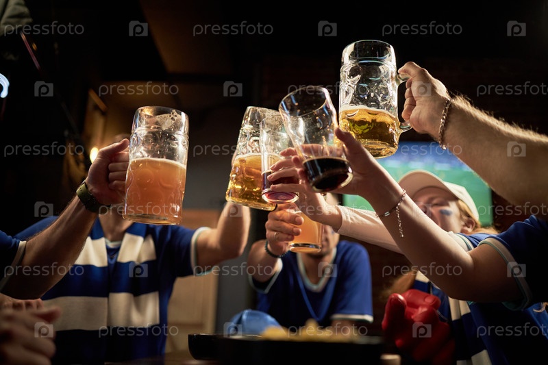 Группа футбольных болельщиков, приносящих тосты с пивом в пабе