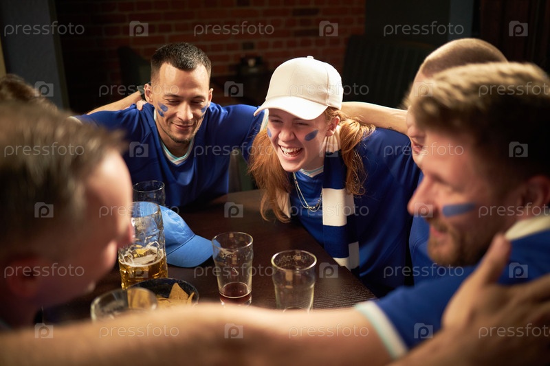 Группа молодых мультиэтнических футбольных фанатов, обнимающихся и празднующих вместе в баре