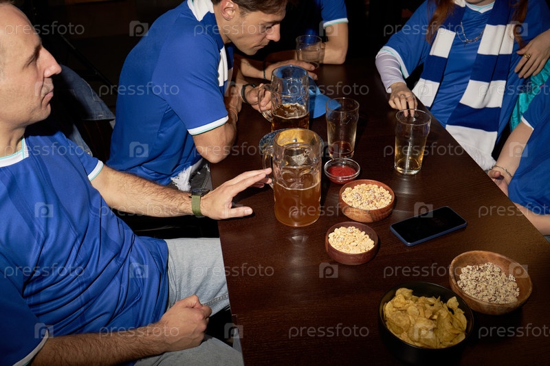 Молодые футбольные болельщики делятся закусками во время матча в пабе