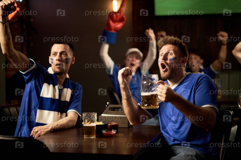 Группа болельщиков, которые радуются во время просмотра футбольного матча в помещении