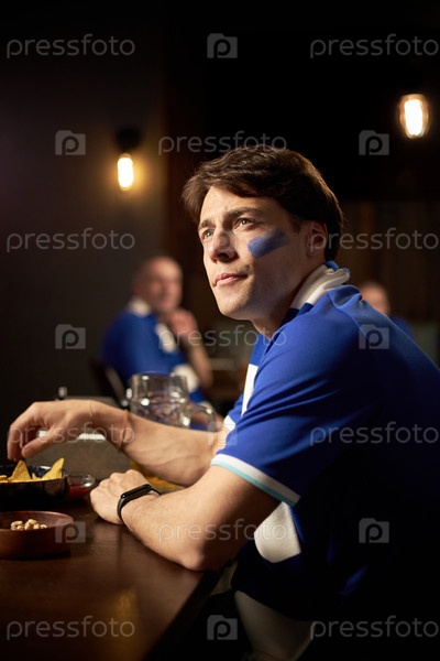 Молодой человек с покрашенным лицом смотрит футбольный матч в баре