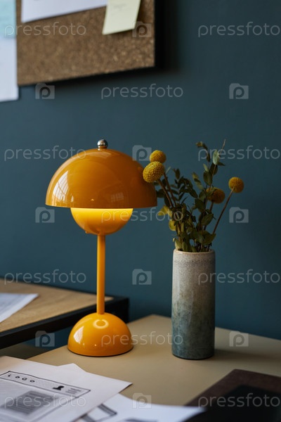 Желтая настольная лампа, освещающая современный стол рядом с вазой с цветами