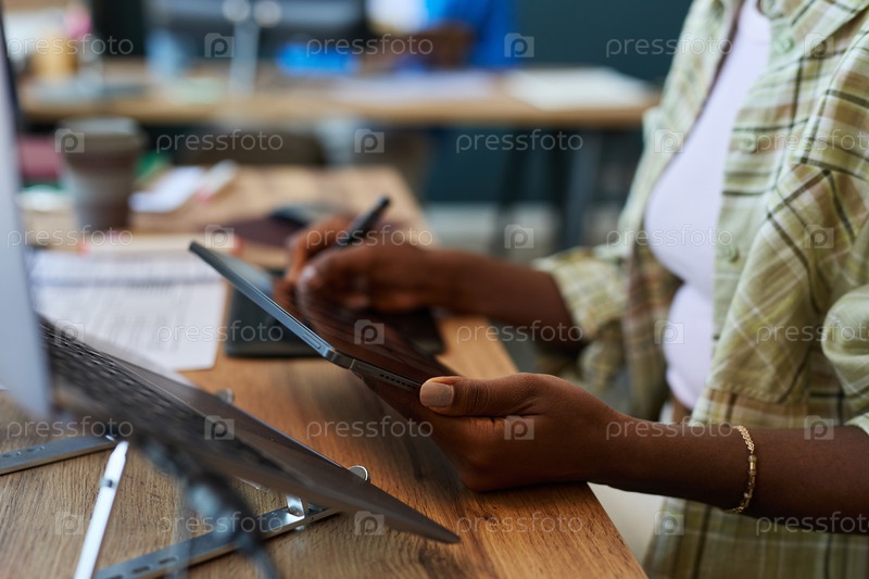 Молодая взрослая чернокожая женщина использует цифровой планшет со стилусом в современном офисе
