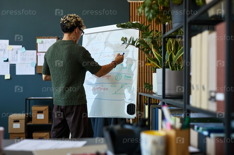Молодой взрослый мультиэтнический мужчина рисует веб-сайт Layout на доске в офисе