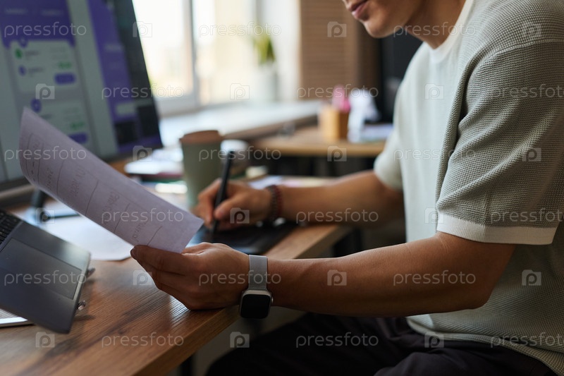 Молодой взрослый азиатский мужчина просматривает документы, работая за столом в офисе