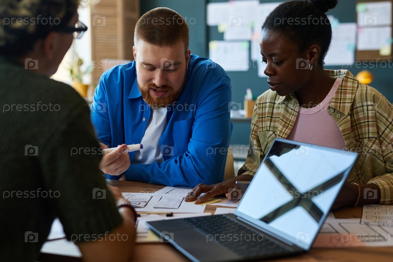 Молодая мультиэтническая команда мозговой штурм Концепции пользовательского опыта на рабочем месте