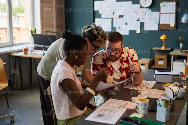 Мультиэтнические молодые взрослые сотрудничают над проектом в современной офисной обстановке