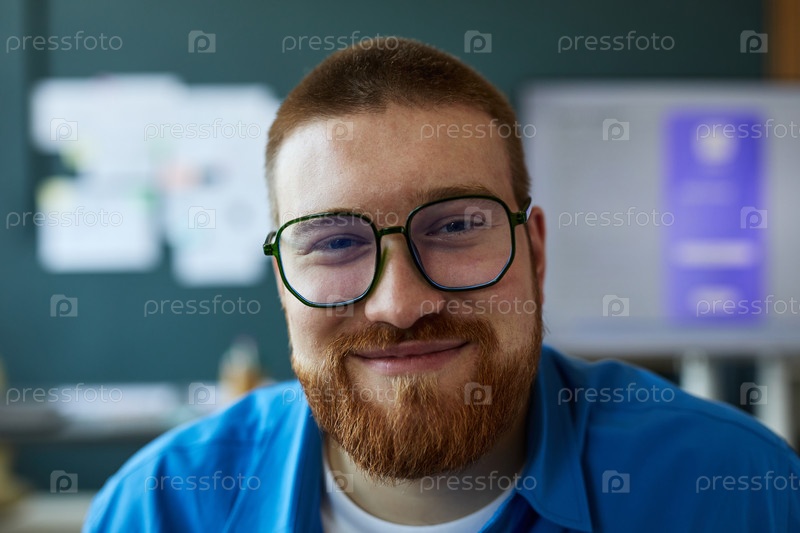 Портрет молодого взрослого мужчины, улыбающегося и смотрящего в камеру