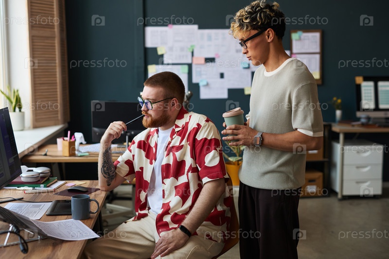 Молодой человек сотрудничает с молодым азиатским мужчиной в современном офисе
