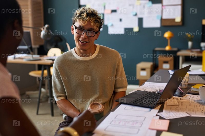 Молодой человек улыбается, обсуждая проект с коллегой в офисе
