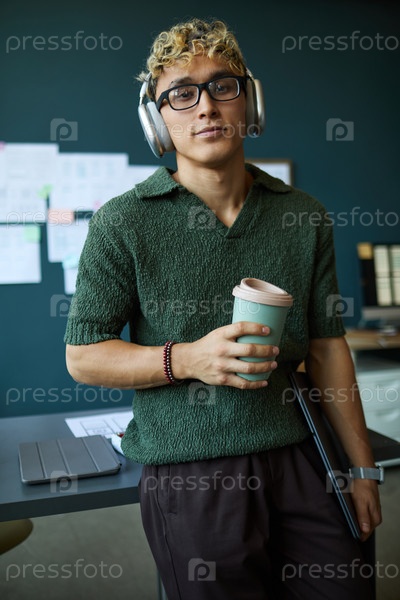 Портрет молодого взрослого мужчины, слушающего музыку и держащего кофе