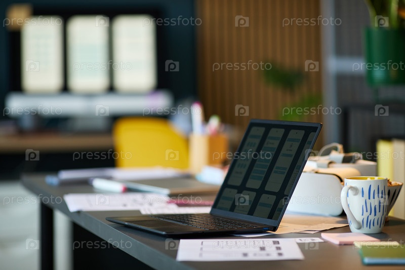 Modern Office Desk Featuring Laptop Displaying Mobile App Wireframes Современный офисный стол с ноутбуком, отображающий мобильные приложения