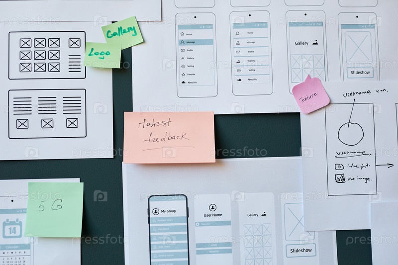 Мобильные приложения Wireframes и Sticky Notes, отображающие процесс планирования дизайна