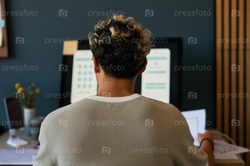 Молодой взрослый мужчина работает на компьютере за столом в современном офисе