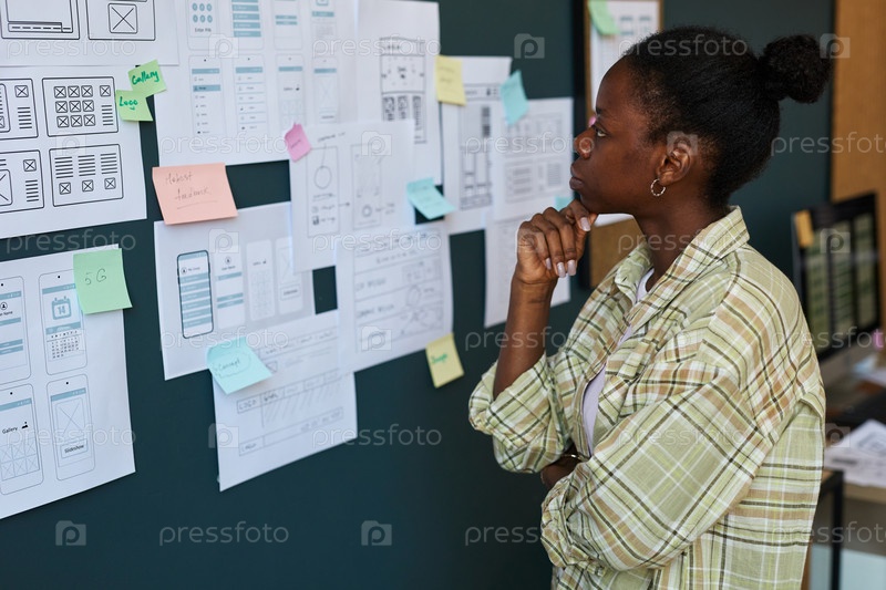 Молодая взрослая чернокожая женщина анализирует мобильные приложения Wireframes на стене в офисе