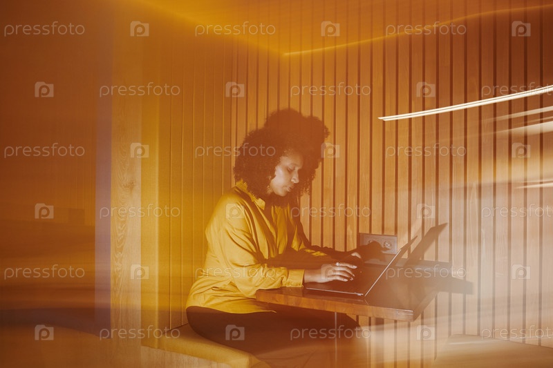 Молодая чернокожая женщина, использующая ноутбук во время работы в современной офисной обстановке