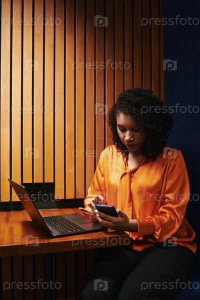 Молодая чернокожая женщина использует смартфон, работая на ноутбуке в помещении