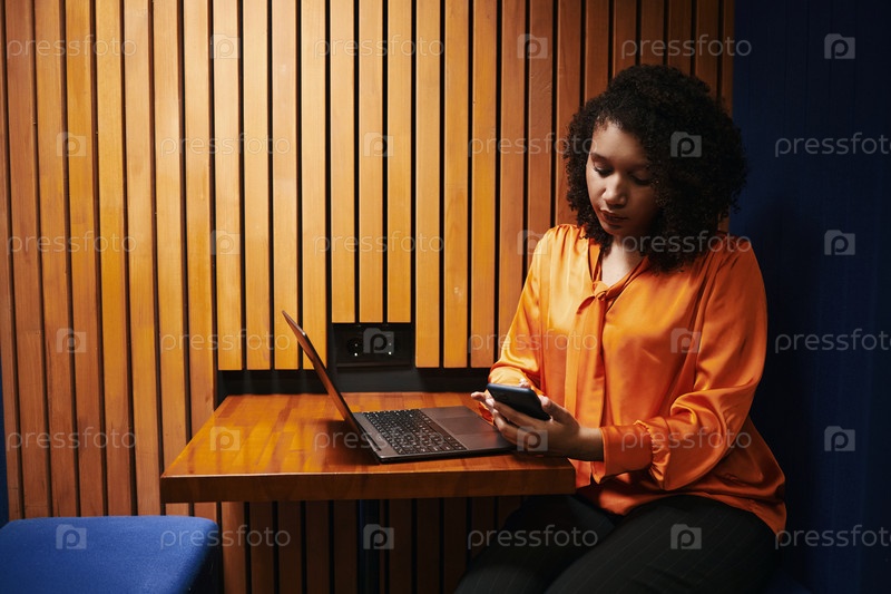 Молодая чернокожая женщина проверяет уведомления со смартфона, сидя одна