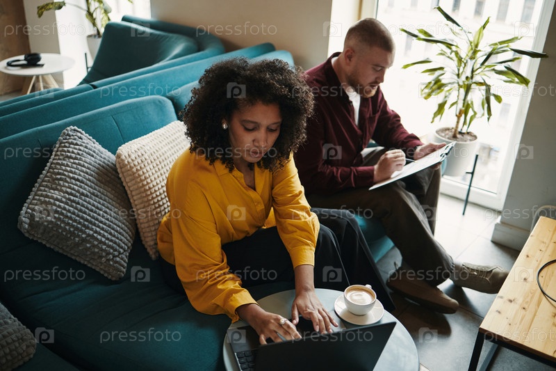 Молодая чернокожая женщина использует ноутбук и молодой мужчина пишет на клипборд
