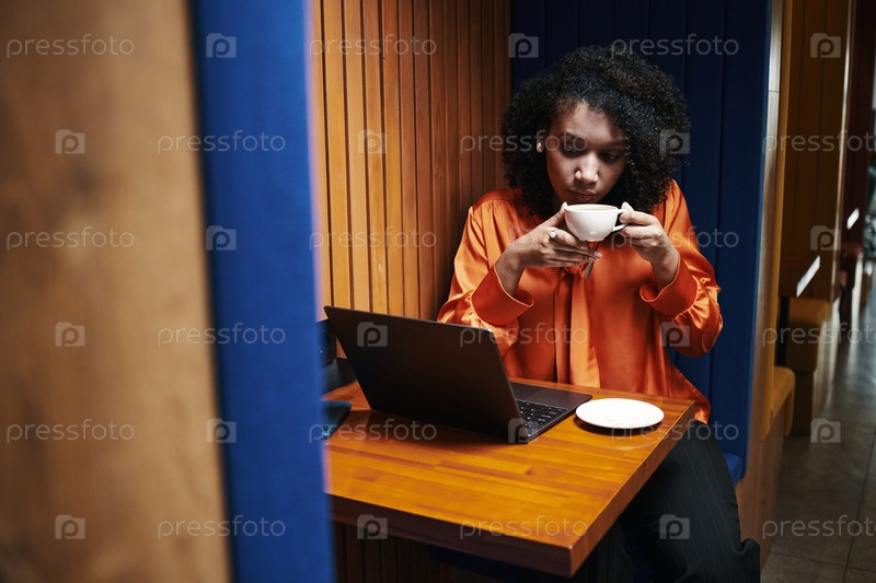 Молодая чернокожая женщина работает на ноутбуке, выпивая кофе в кафе Booth