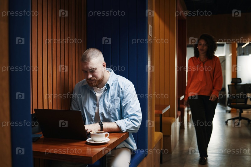 Молодой предприниматель-мужчина использует ноутбук, сидя в офисной будке