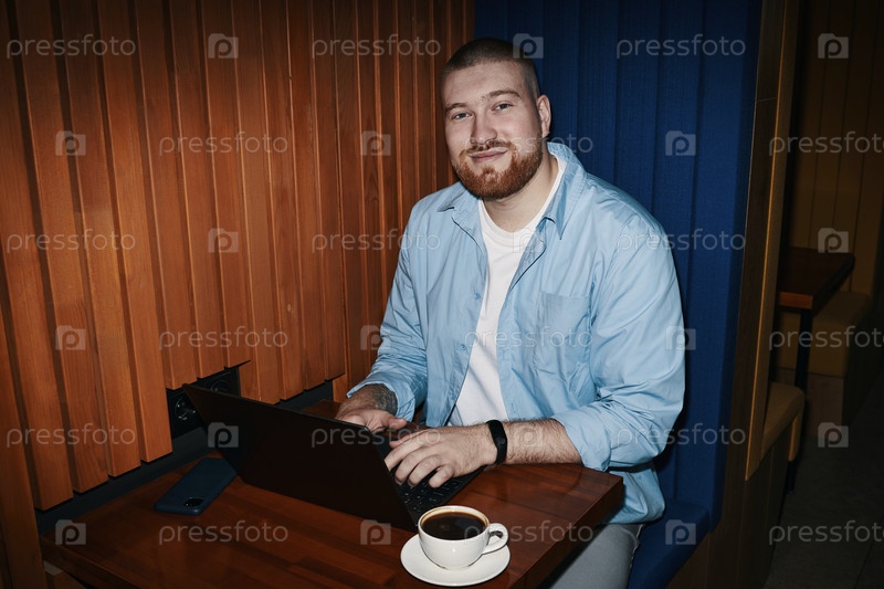 Портрет человека с ноутбуком, улыбающегося в коворкинговой будке