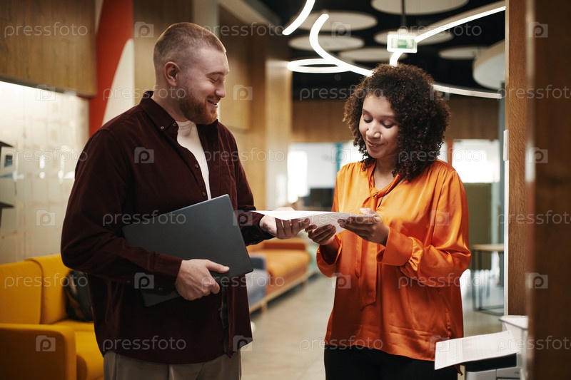 Молодой человек и чернокожая женщина обсуждают документы в современном офисе