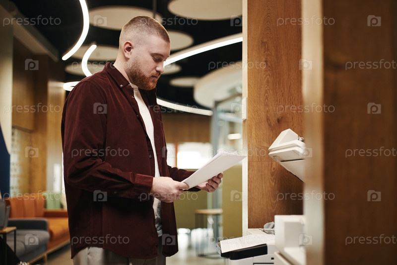 Человек, использующий принтер во время чтения документов в офисе