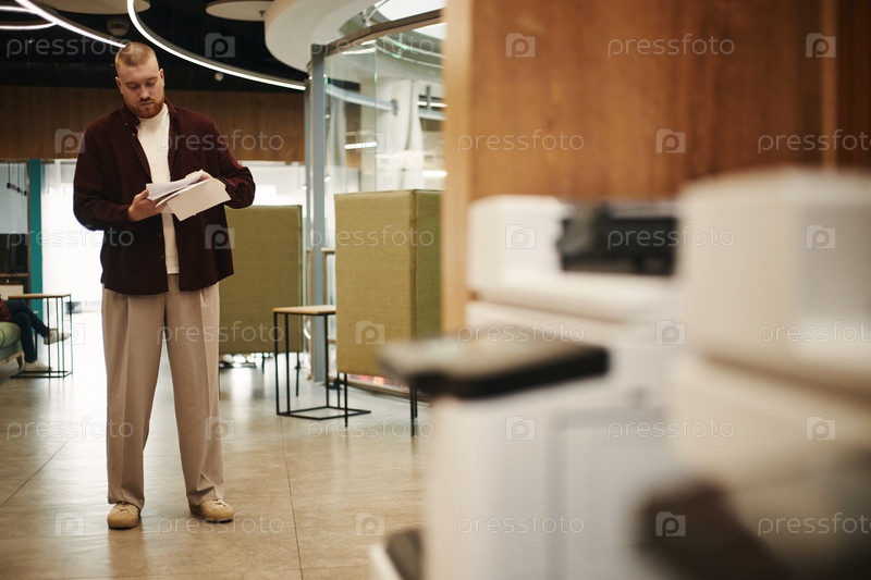 Молодой человек просматривает документы возле офисного принтера