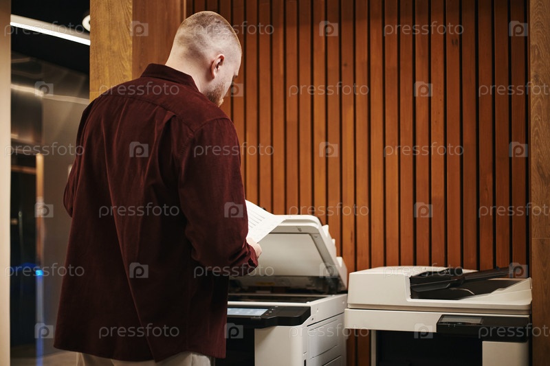 Молодой человек, работающий с копировальной машинкой в современной офисной обстановке