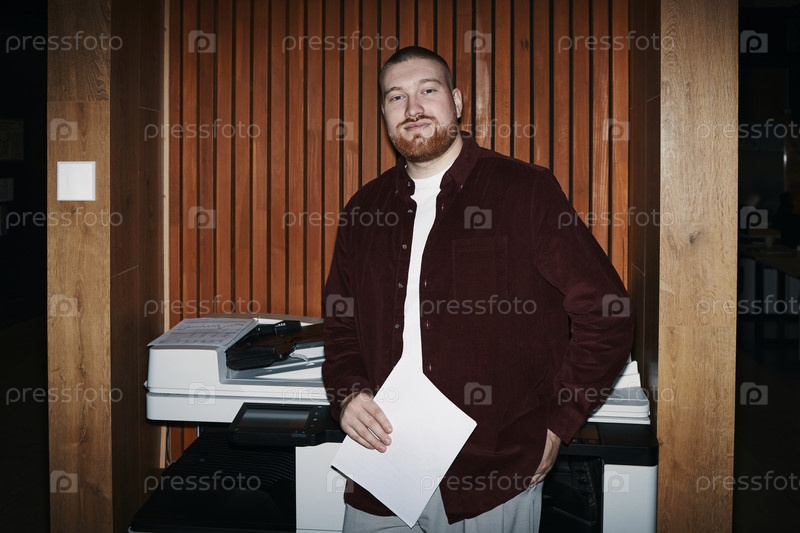Портрет молодого рыжеволосого мужчины, стоящего у фотокопировщика в коворкинговом офисе