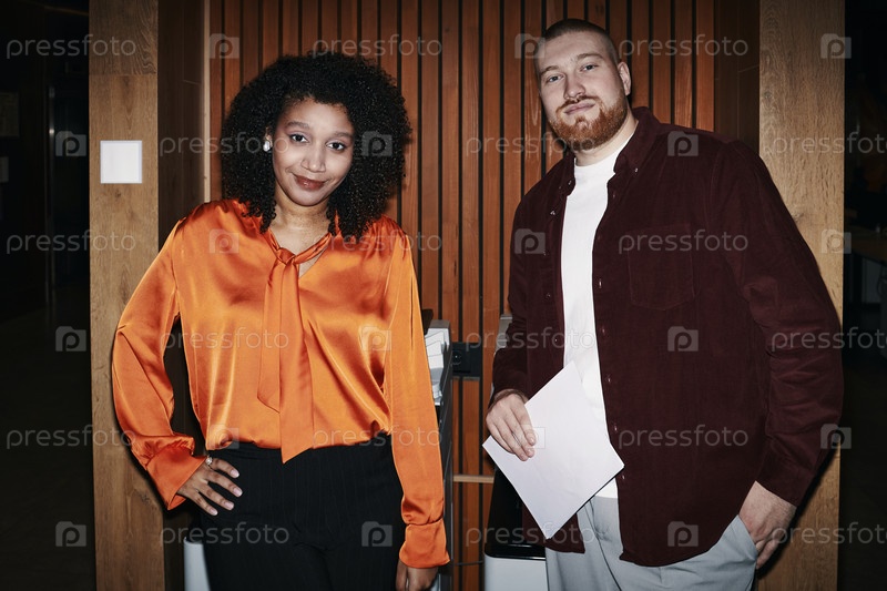 Молодая чернокожая женщина и молодой мужчина позируют вместе в офисе