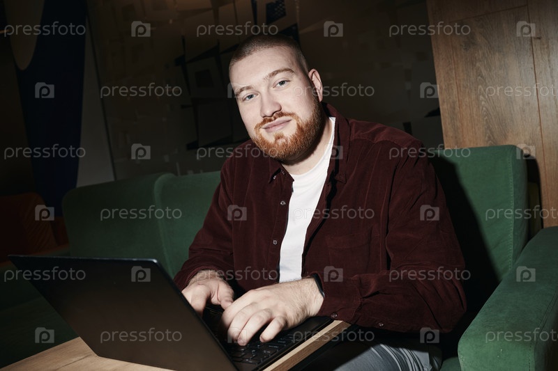 Портрет уверенного молодого человека, улыбающегося при использовании ноутбука