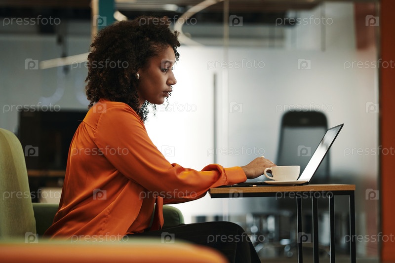 Молодая чёрная женщина печатает на ноутбуке, сидя в современном офисе