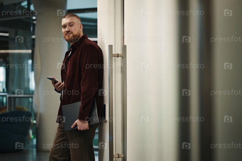 Портрет молодого человека, держащего смартфон и ноутбук в помещении