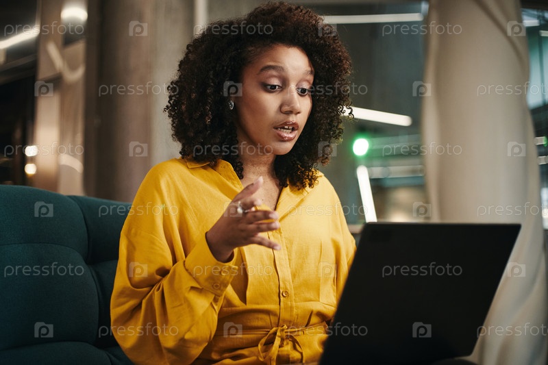 Черная женщина жестикулирует, говоря во время видеозвонка в офисе