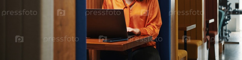 Женщина, использующая ноутбук во время работы в офисной будке