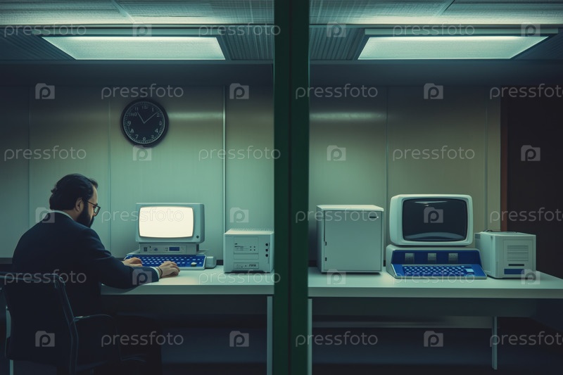 Человек, работающий на ретро-компьютере в тускло освещенной комнате