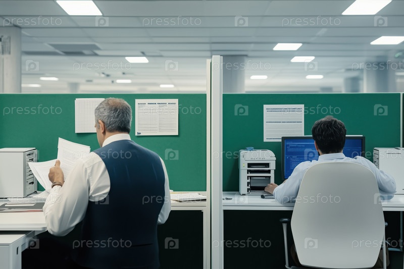Сотрудничество в современной офисной обстановке с документами и компьютерами