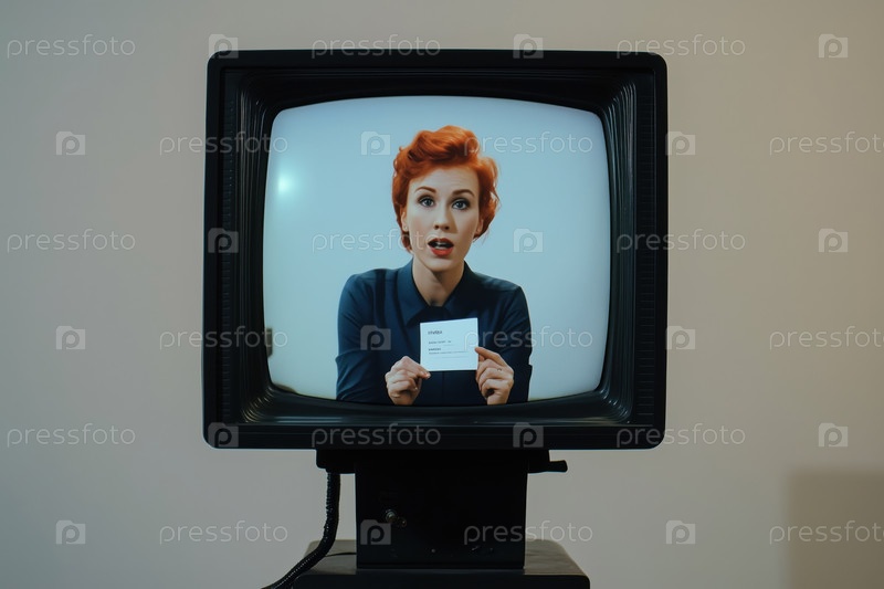 Портрет женщины, держащей карточку на экране телевизора