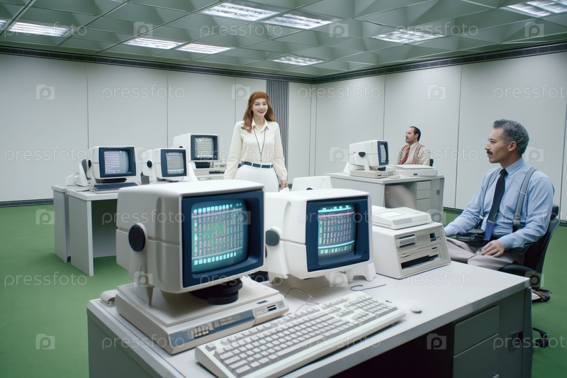 Сотрудничество в современном офисе с винтажными компьютерами