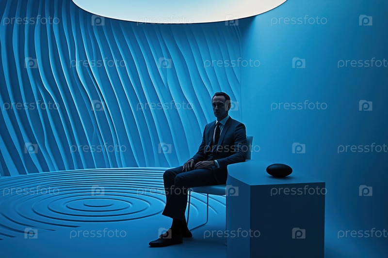 Бизнесмен сидит в современной голубой комнате с волновыми узорами