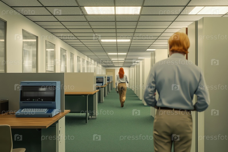 Люди, работающие в условиях длинного коридора открытого офиса
