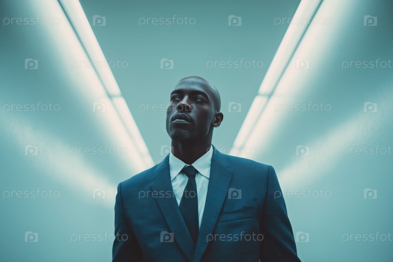Портрет бизнесмена в коридоре с люминесцентным освещением