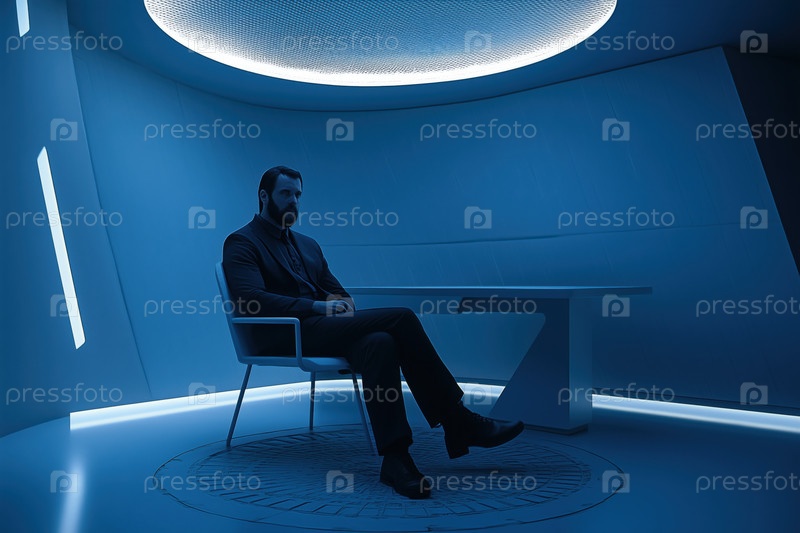 Человек, сидящий в футуристической голубой комнате с современным освещением