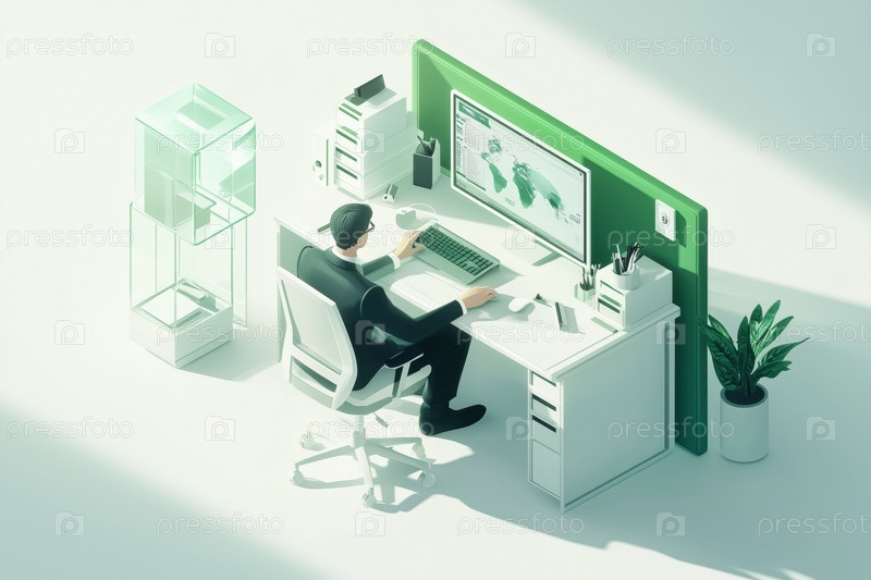 Работа в минималистическом офисном пространстве с зелеными акцентами